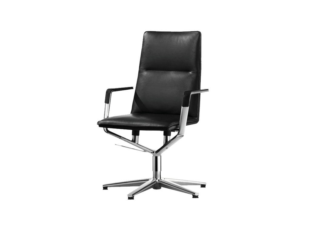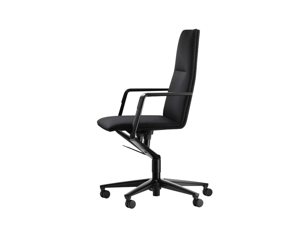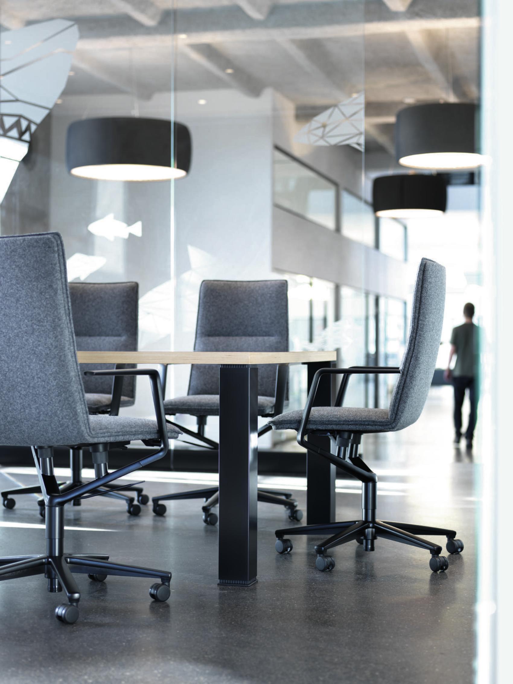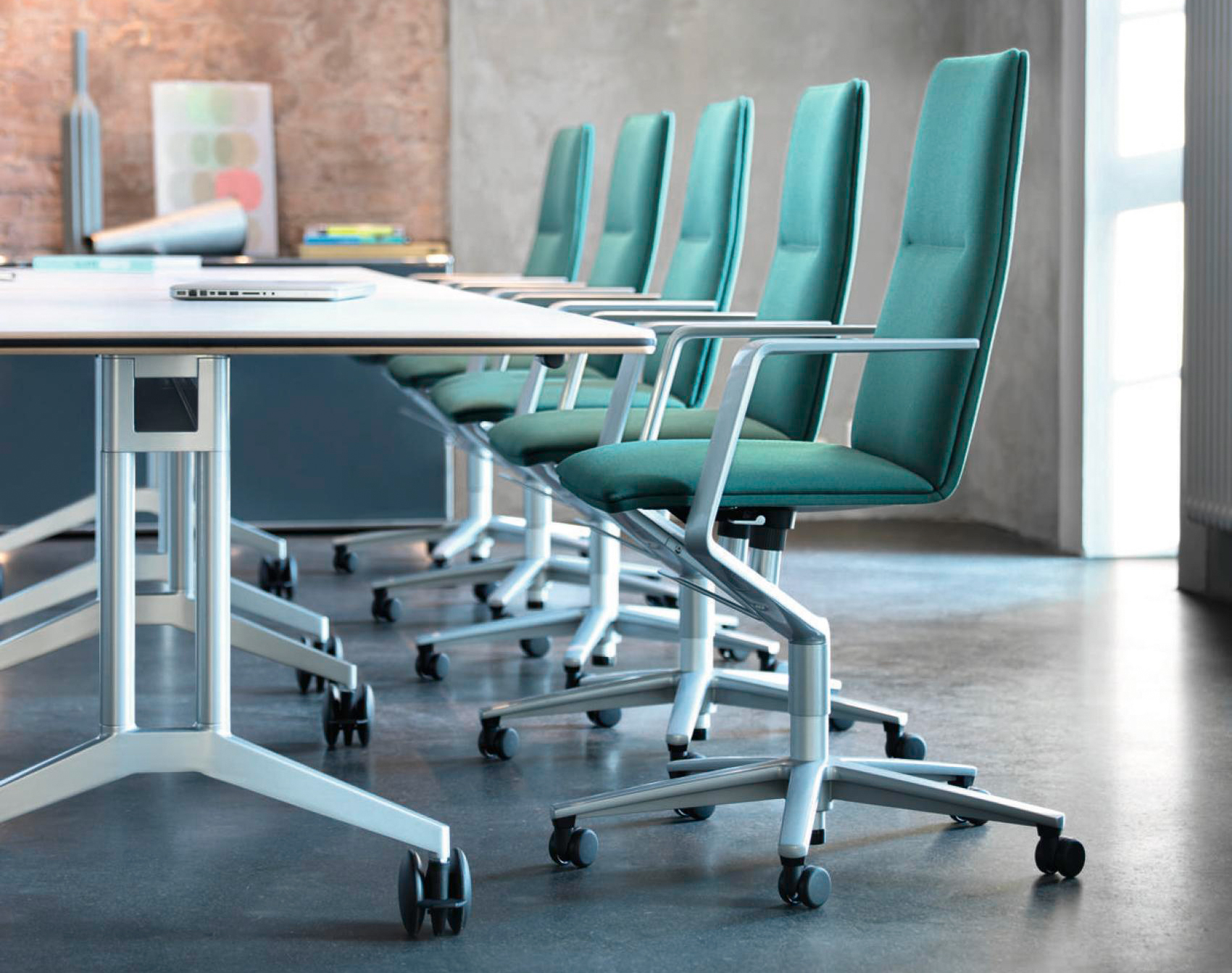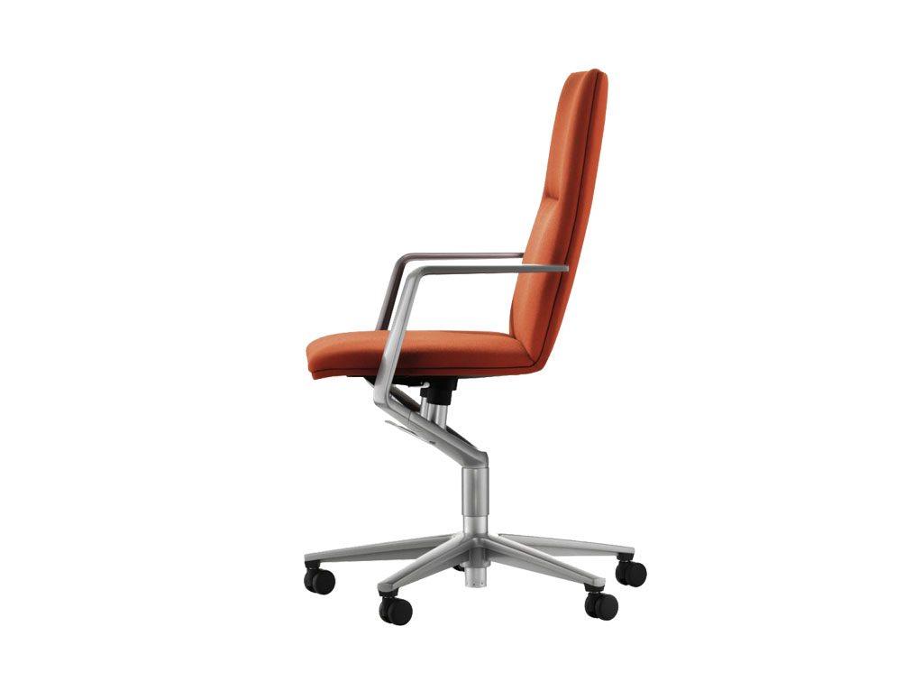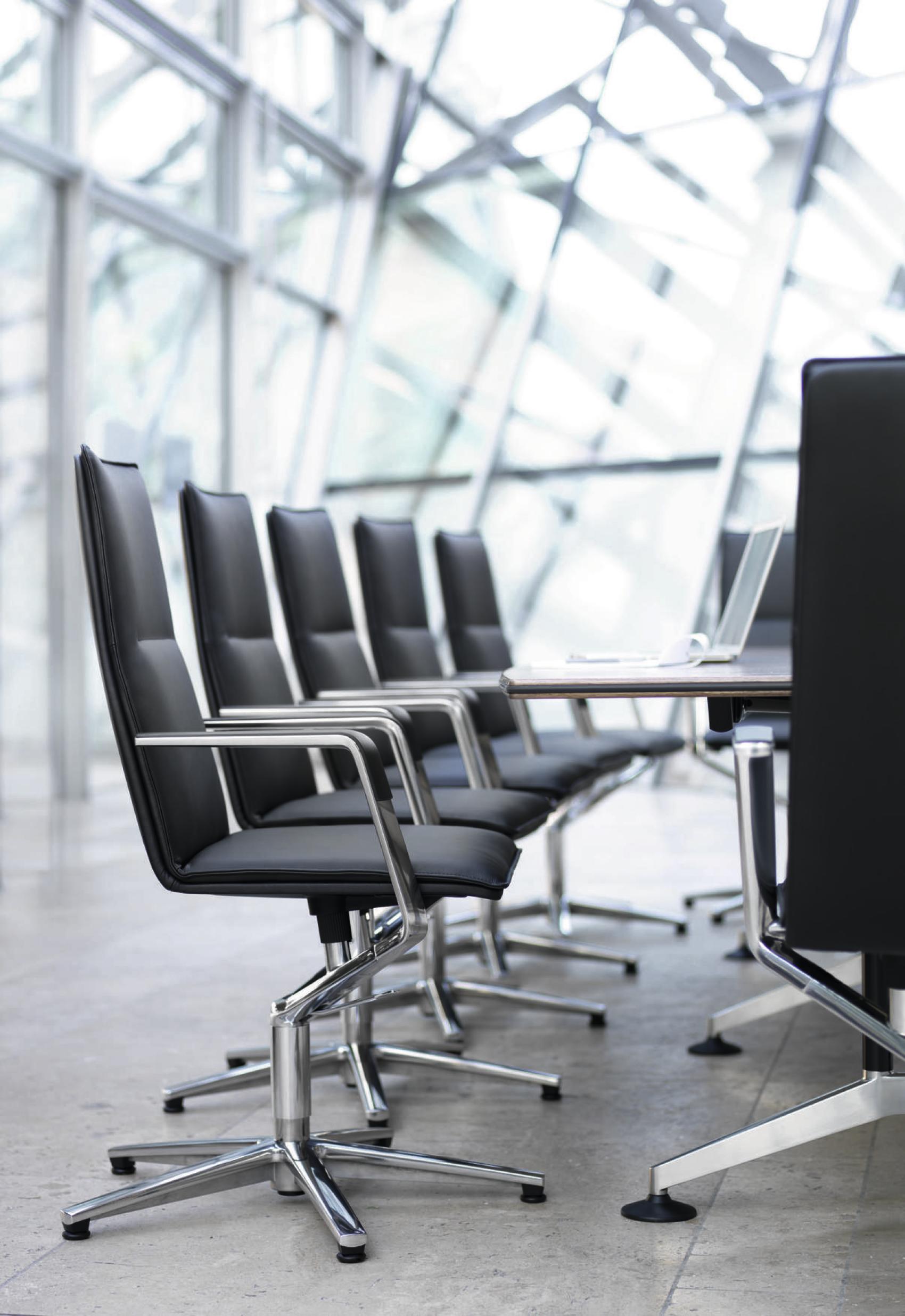 In typical Wilkhahn style, the swivel mounted and height-adjustable Sola conference chair combines innovative comfort with a crisp design and high quality appeal. The chair’s aesthetic is defined by the linear shape of the seat shell and the distinctive lines of the aluminium frame. The frame branches out from the centre column into a V-shaped support that culminates in the armrests. The clever part is that the slender seat shell is swivel-mounted at the front and connected with a V-shaped support by two pressure springs at the rear. As a result, the chair offers sprung comfort, adjustable to suit preferences and a rocking motion so body and mind stay alert however long meetings last. In addition to the clear design and the rocking feature, the first-class craftsmanship of the upholstery is also impressive.