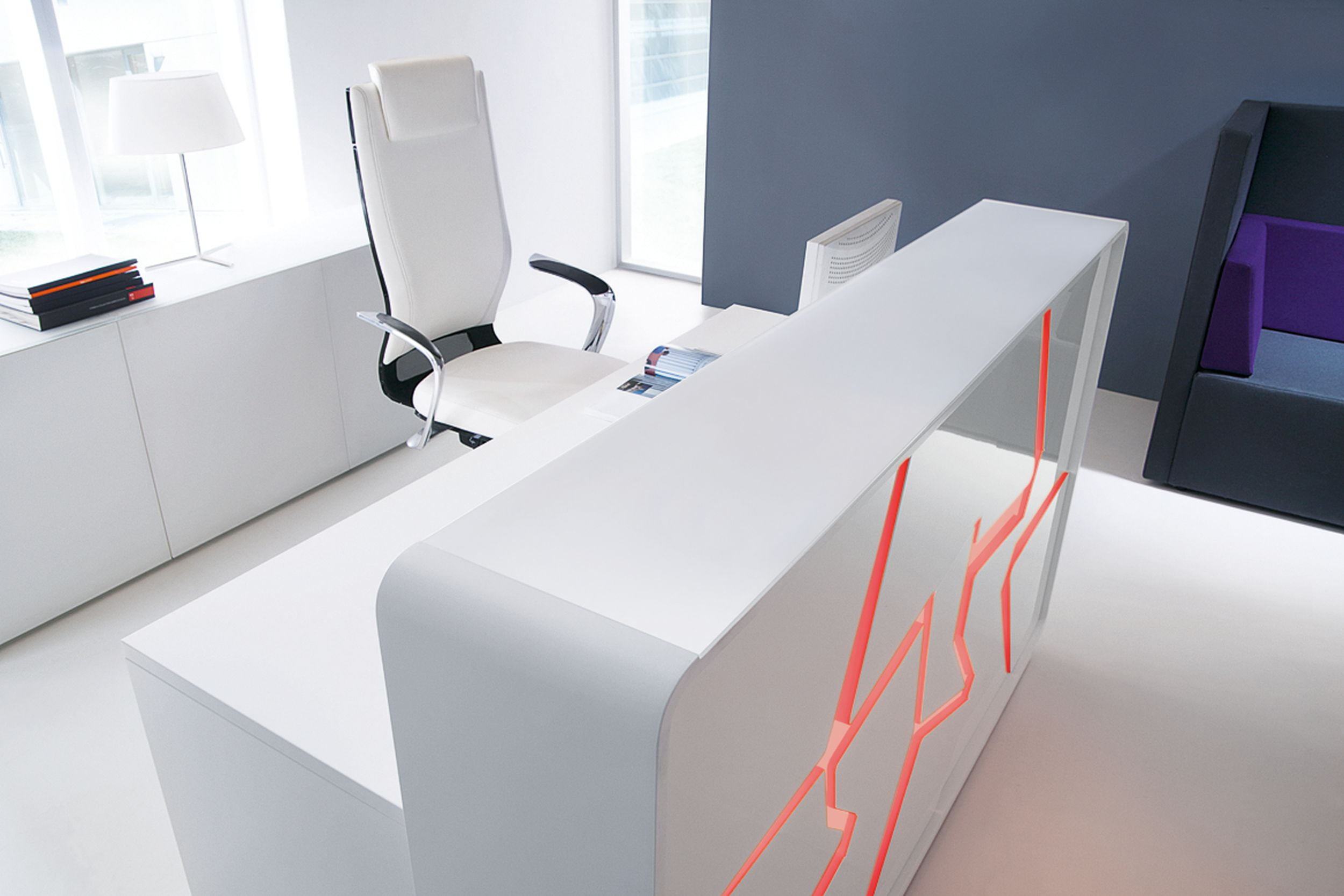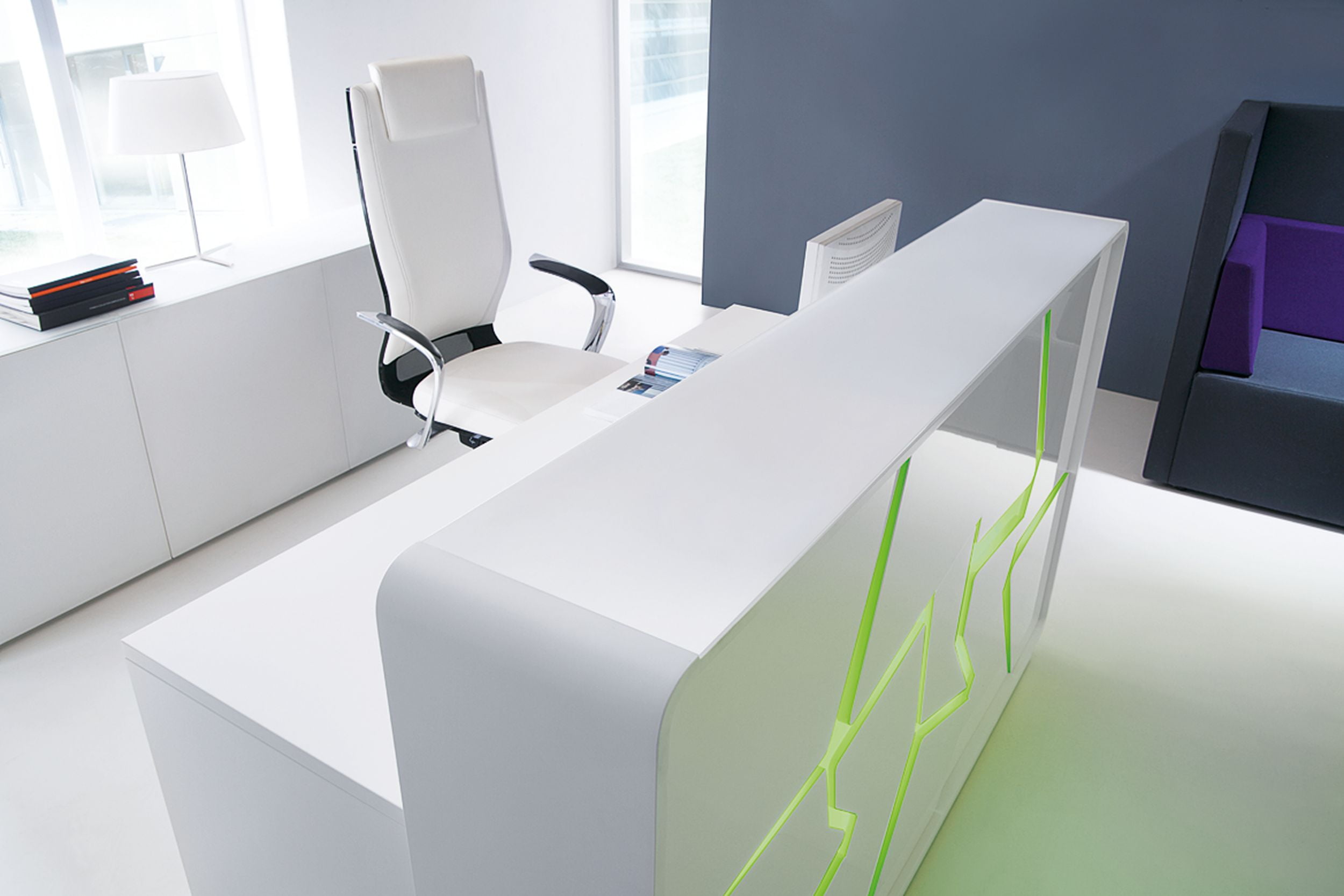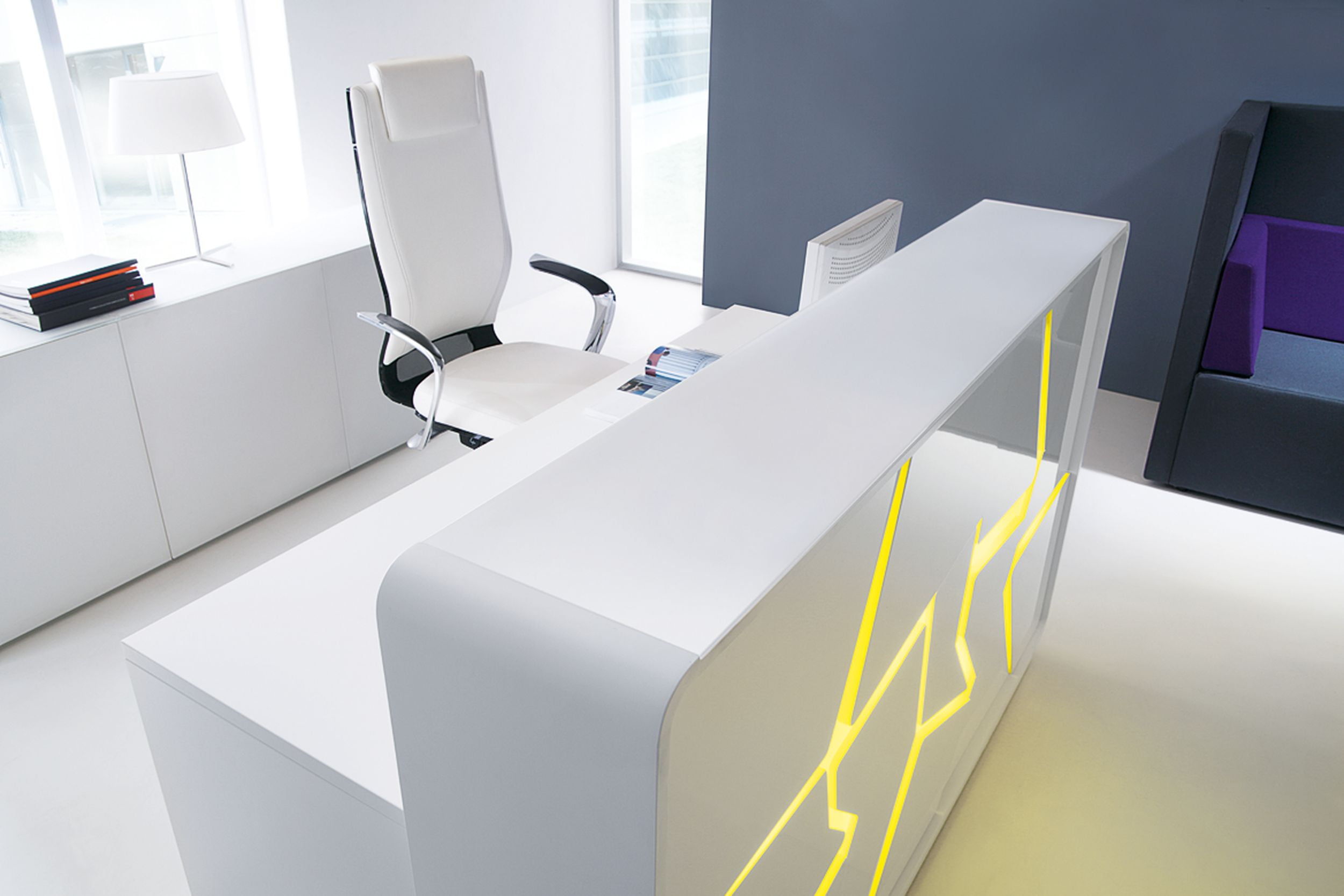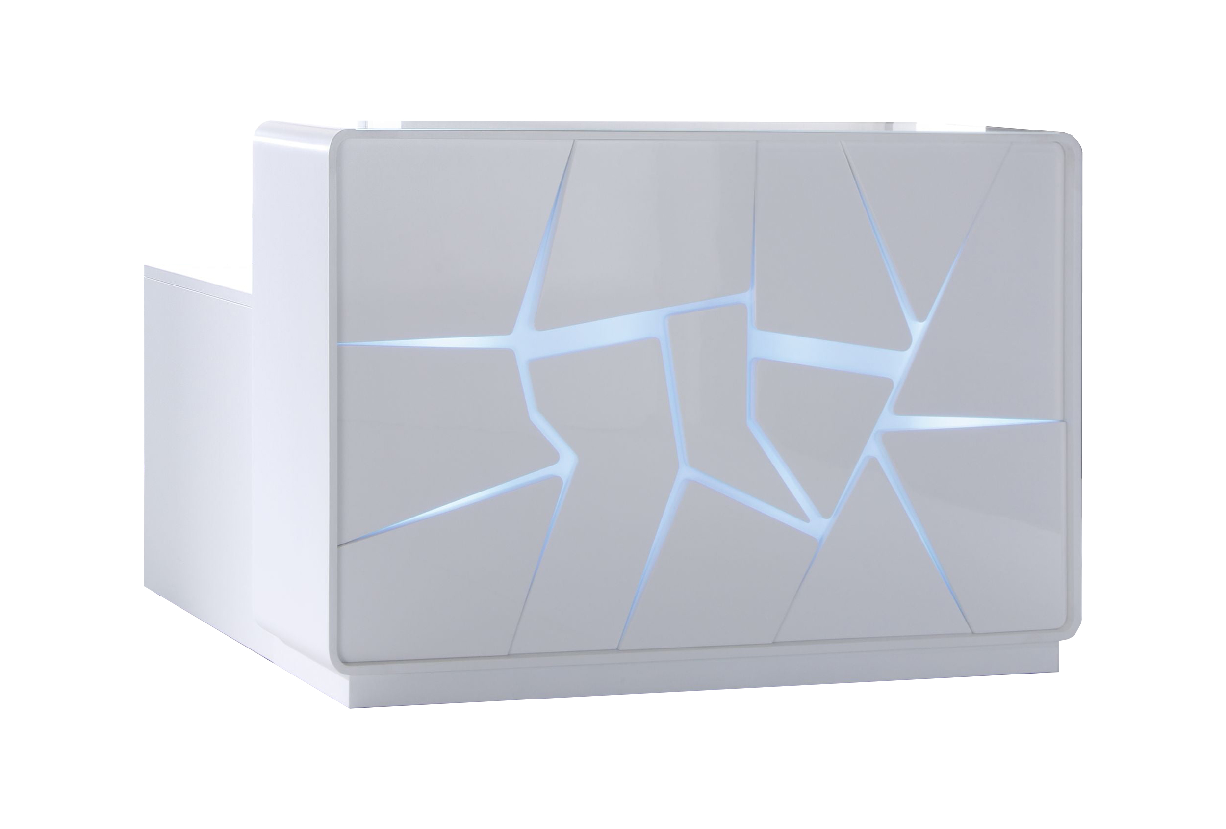 White means purity, perfection and confidence. The desktop is made from pastel white lacobel glass, so are the front and sides of the reception desk. The pattern of Arctic Summer emphasises fluorescent white light. Opposites attract. Arctic summer – ice flow warmed up with the glow – tube lighting. The fancy design of this reception desk is intended for people with imagination, who appreciate elegance and dislike monotony. |