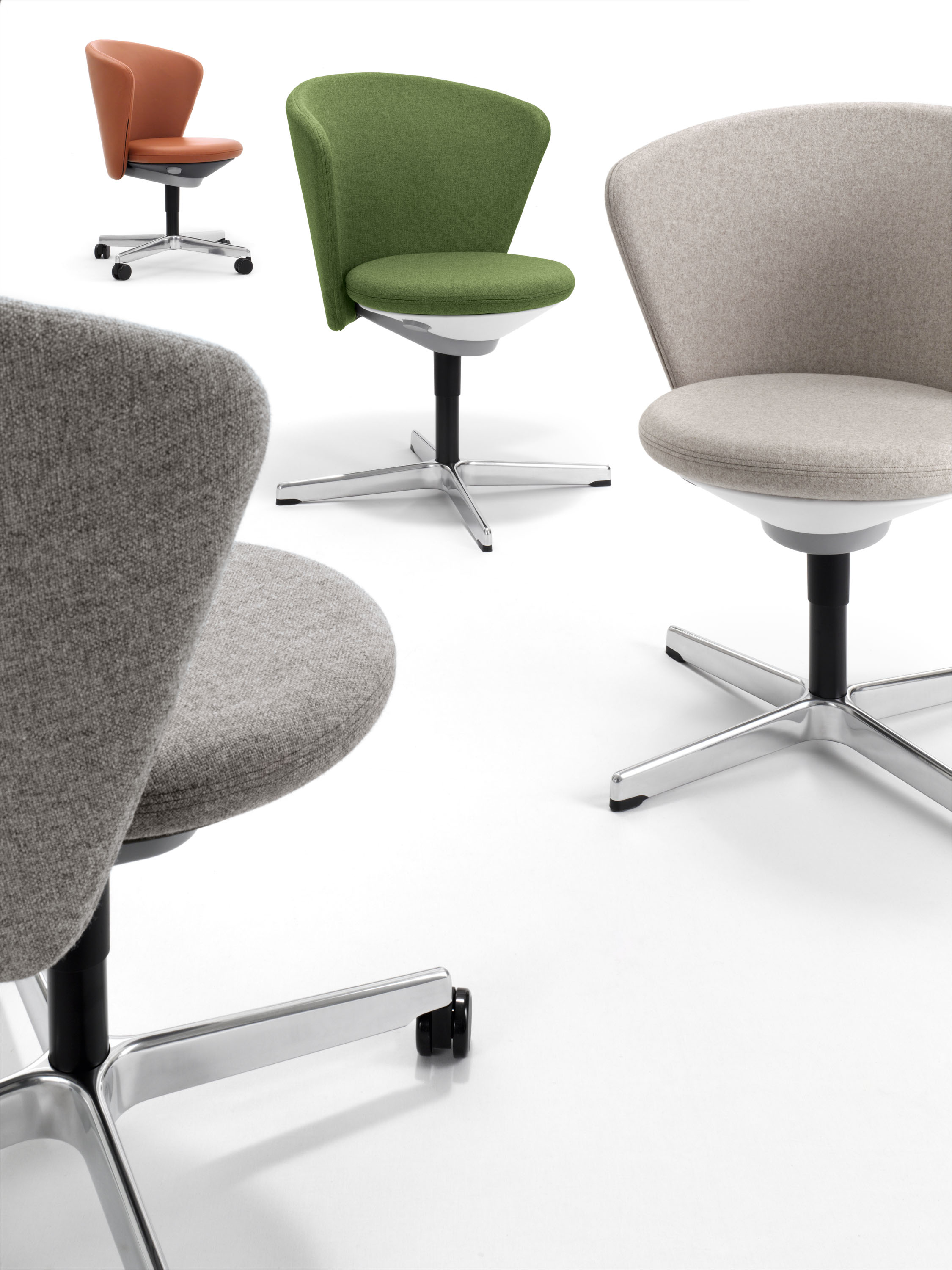 An emotional design, with organically flowing lines: Soft styling with a human touch, created as a counterbalance to the strict geometric shapes in the office. The Bay Chair adjusts to alternating users and as such is suitable for teamwork, meetings, and collaboration in open communication zones, or for temporary focused work. Counter chair version for working at higher tables or counters.
