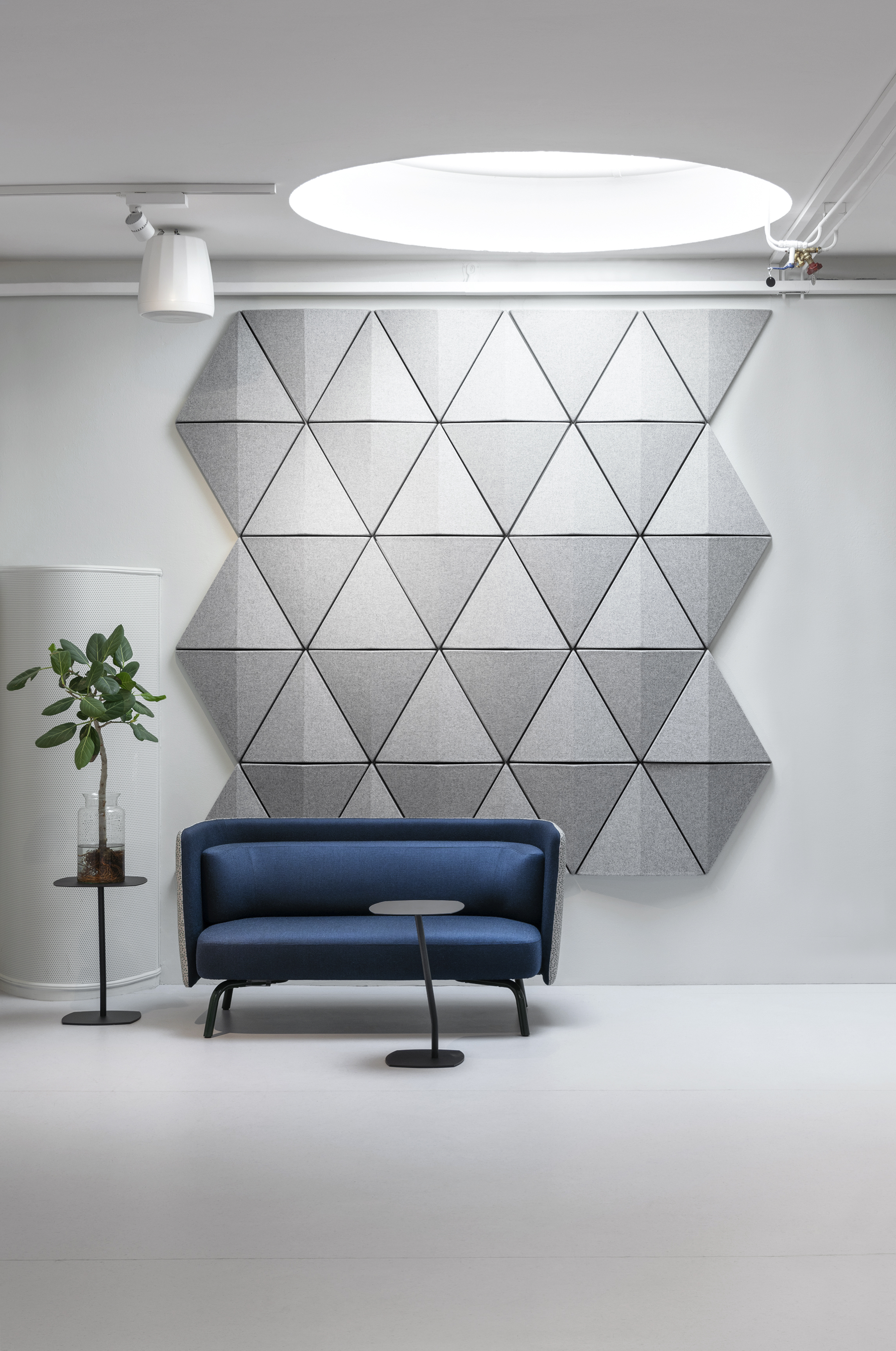 Anya Sebton’s award-winning screen concept, Bits Wall, is based on the triangle – a geometric shape rich in symbolism. Here, the triangular form provides visual energy while contributing to a better soundscape by diffusing sound waves and thus preventing echoes. The triangular Bits Wall panels can be mounted both horizontally and vertically, allowing you to combine them in any desired pattern. Technical information, sizes and dimensions