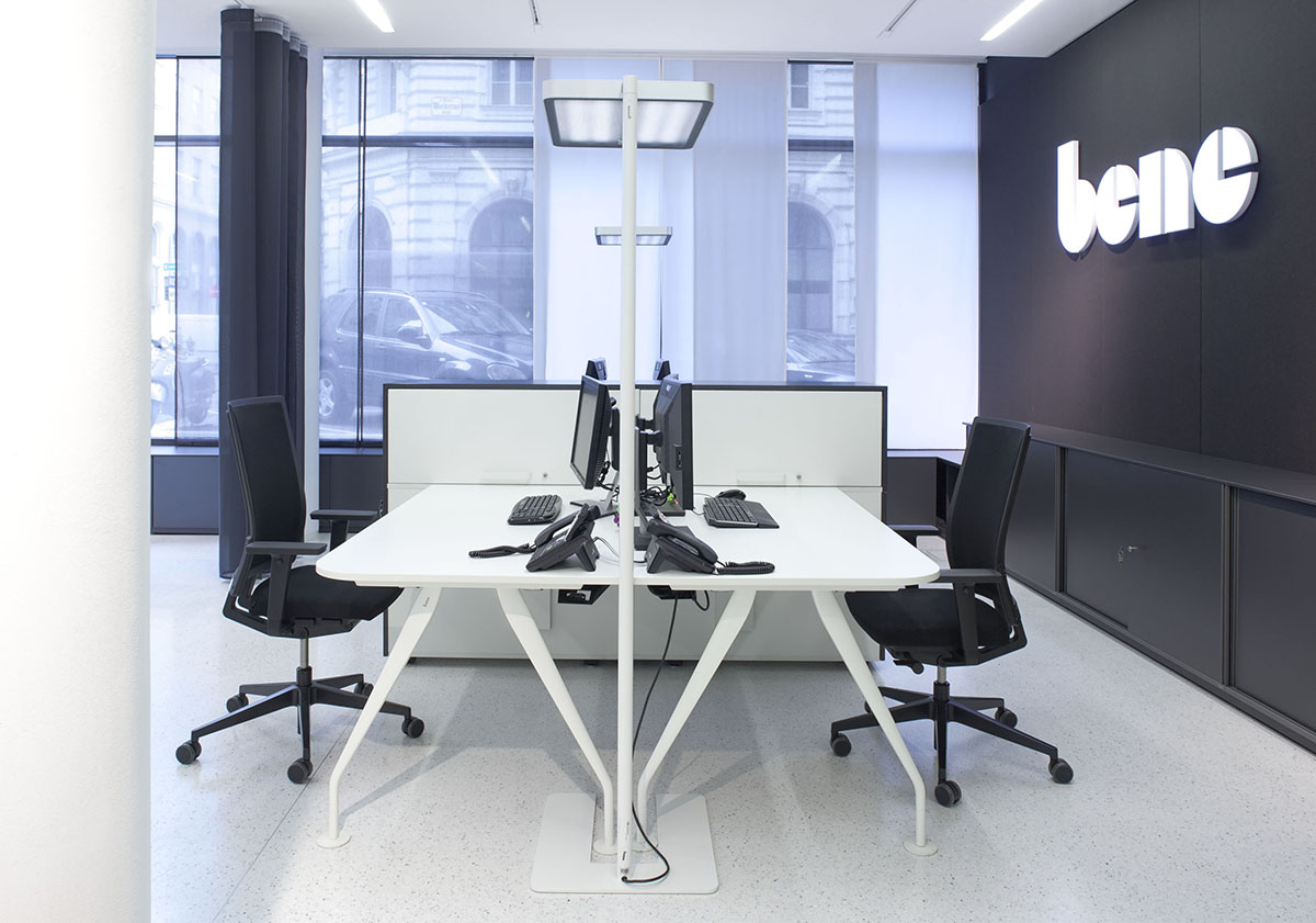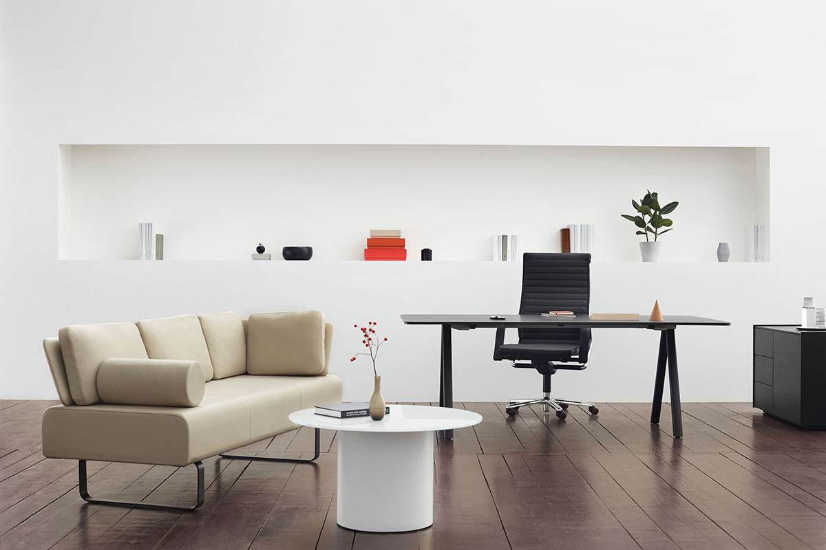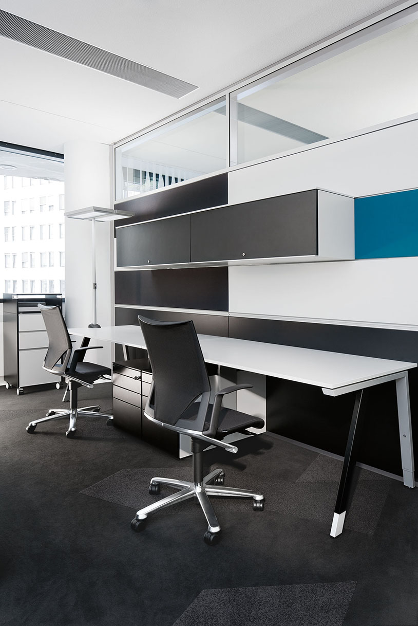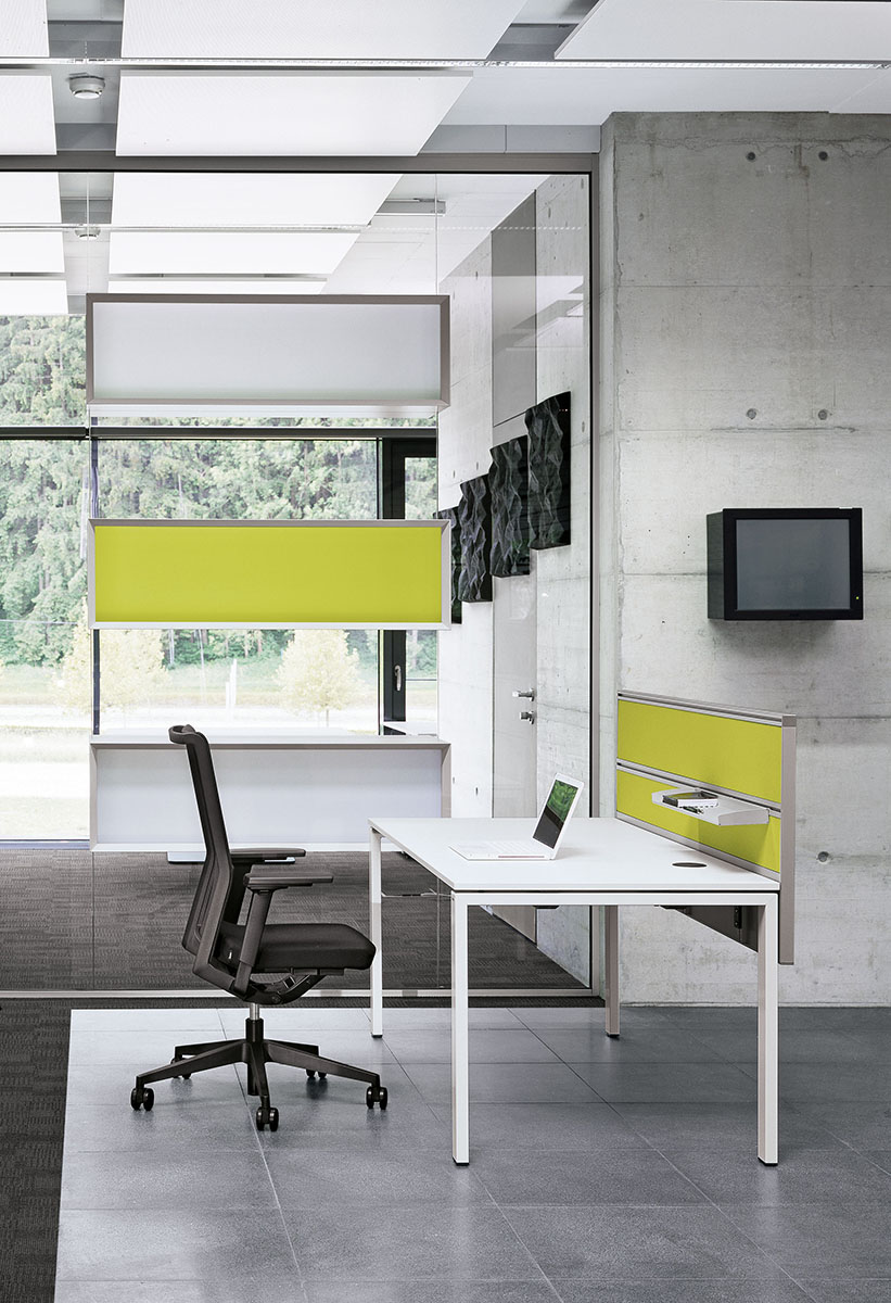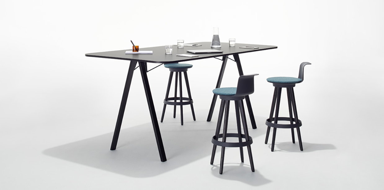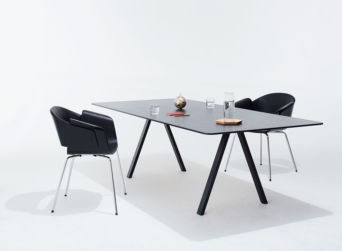 Special details give the table system a fresh look. A striking table frame in cool steel or warm natural oak.
