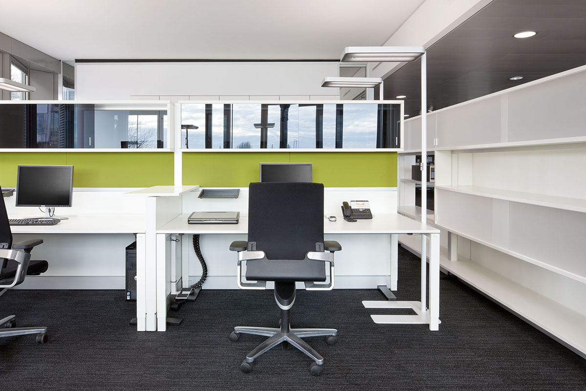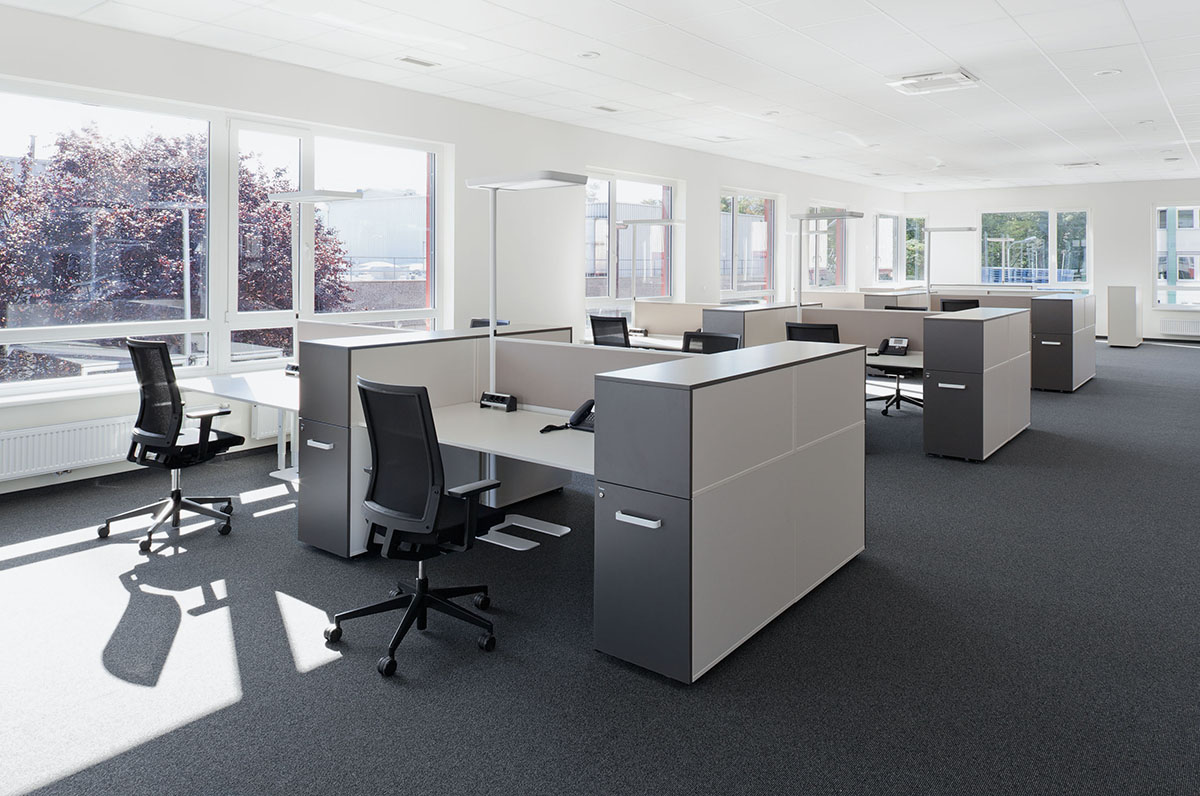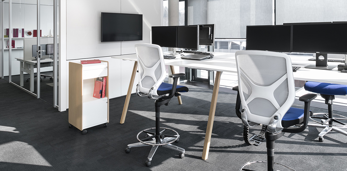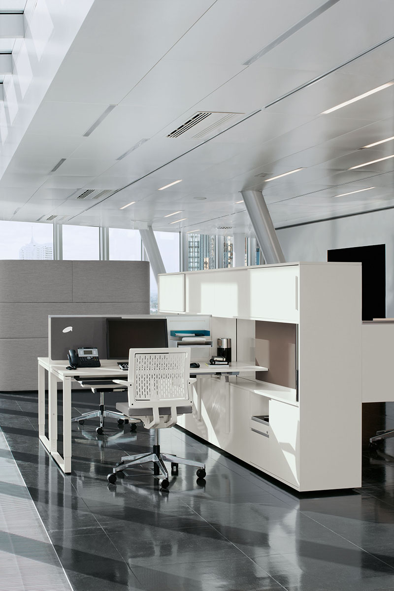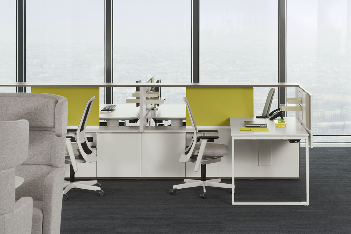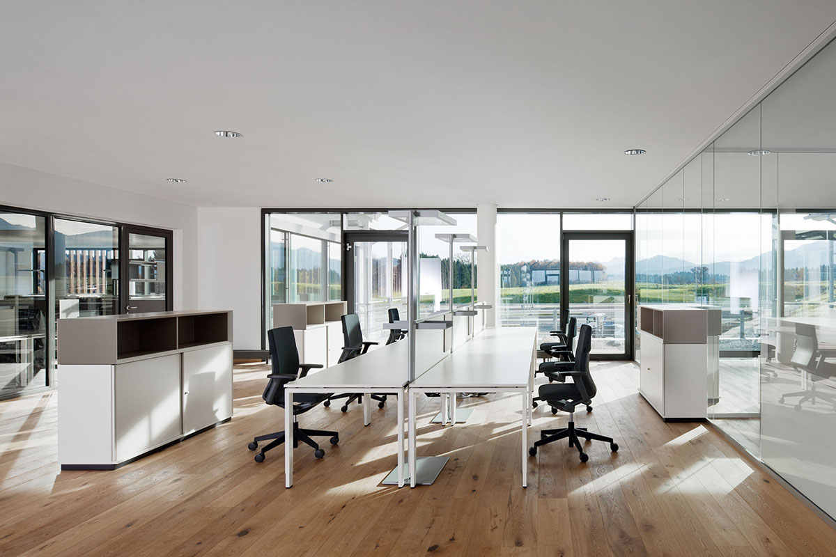 Special details give the table system a fresh look. A striking table frame in cool steel or warm natural oak.