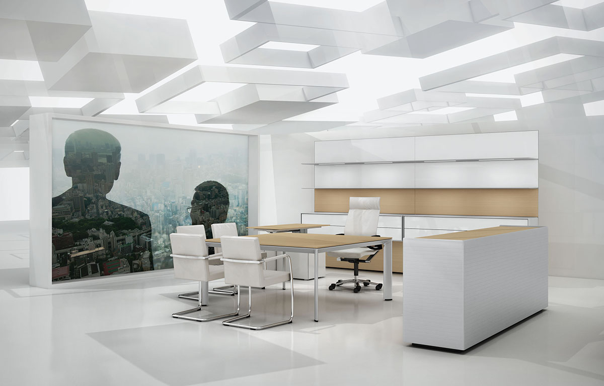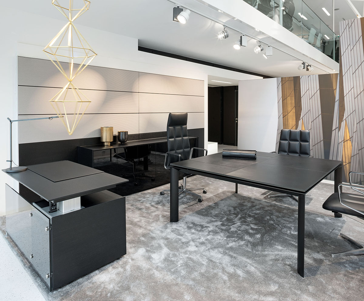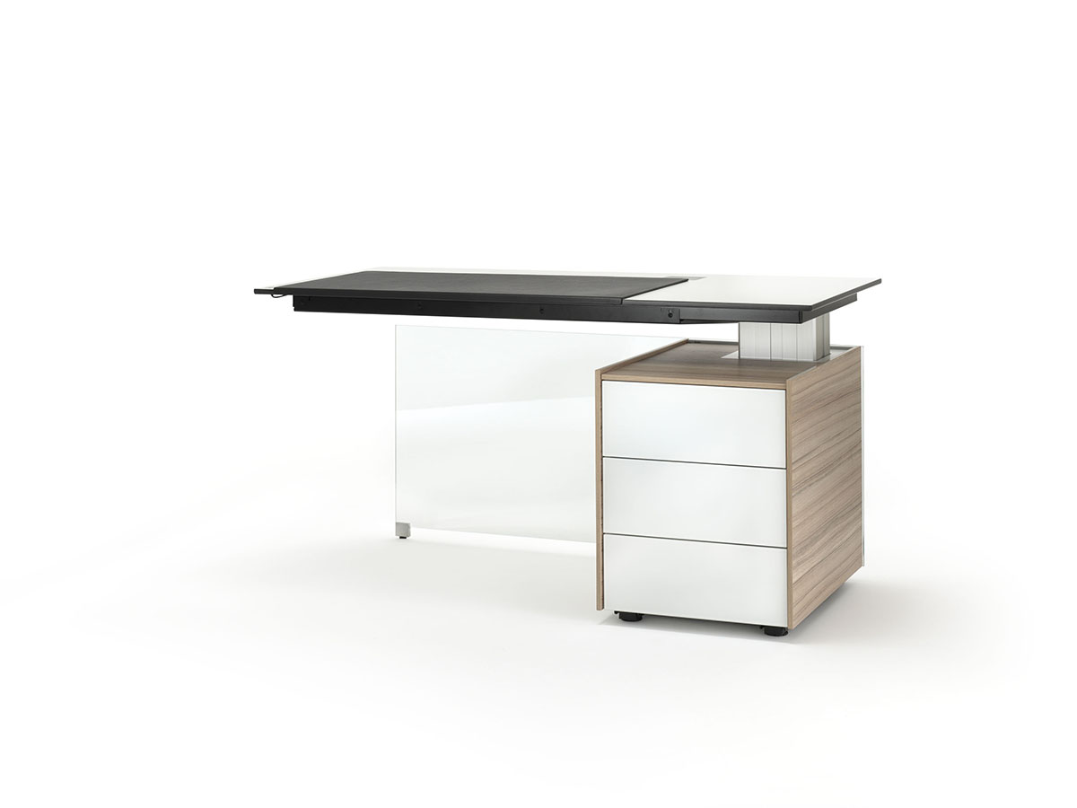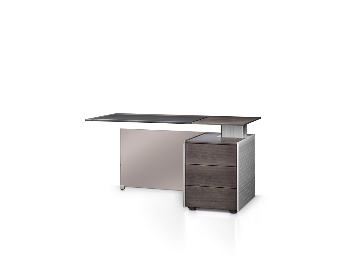 High-quality furniture for personal, focused work in the executive area, the Free Desk is a highly valued computing workstation for executive offices. Electrical height adjustment enables the user to switch spontaneously between standing and sitting height. Due to the unusual placement of the core elements, generous legroom and a high level of comfort are achieved.