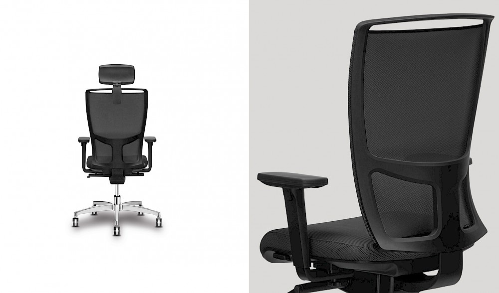 Note is the professional seating collection with distinctive and ergonomic design and upholstery with an innovative technology, fully breathable and highly elastic, as a guarantee of aesthetic and functional excellence. The synchronised mechanism for regulating the angle of slant between seat and back offers five positions with anti-shock system. The depth of the seat can be customised. The height-adjustable ergonomic back also has a headrest with different possible positions.