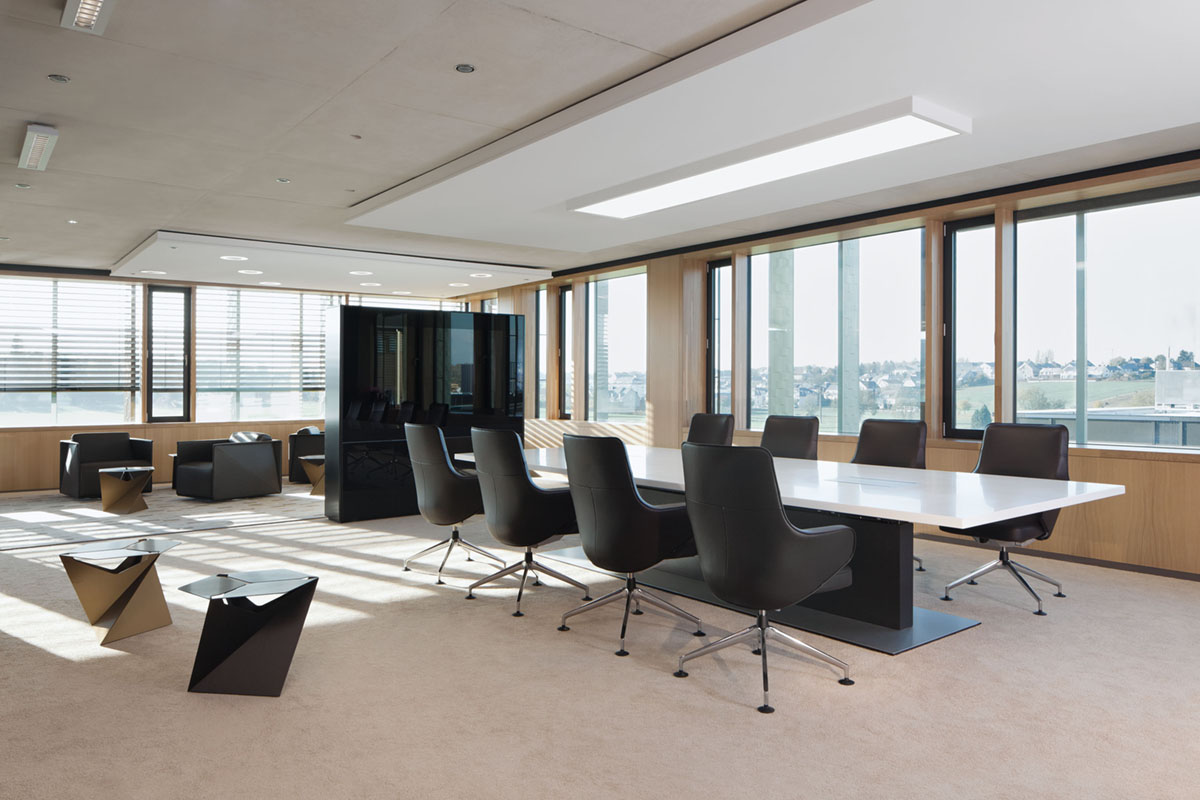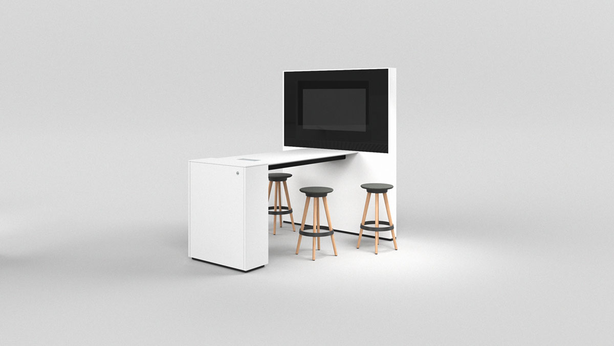 Different Idea Wall models are available with diverse, elegant solutions for cabling. Whether under the table top for the Idea Wall low with table, behind the Ply Tray in the Idea Wall Corner, or with an aluminium flap on the Idea Wall Bridge. Access to electricity, networks, or video and audio are hidden away yet easy to reach. Ply Tablar