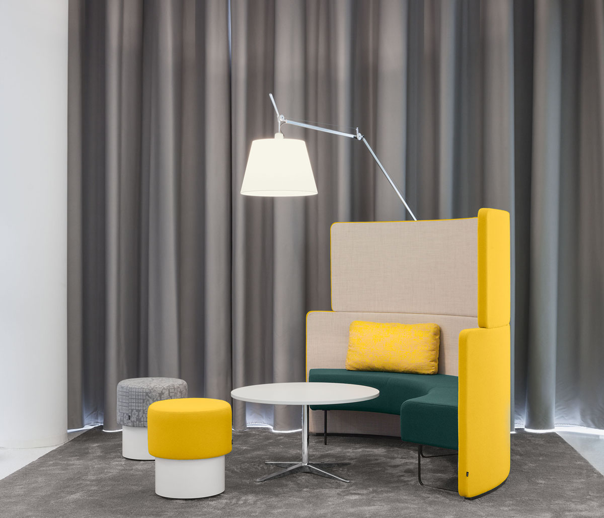 TOGUNA CIRCLE SMALL – THE LIGHT VERSION OF THE TOGUNA CIRCLE.Two upholstered Soft Wall elements enclosing a radius of 2200 mm when placed facing each other, height 1410 mm. The Soft Wall elements form a single unit with the curved Toguna Benches. No floor, no ceiling. The elements can also be set up individually, forming a more open spatial setting. The Toguna Circle Small thus provides a great deal of flexibility in both design and use. For informal meetings, workshops and relaxed discussions. The interior fittings can be freely selected: cushions, stools and tables. * see all technical information |