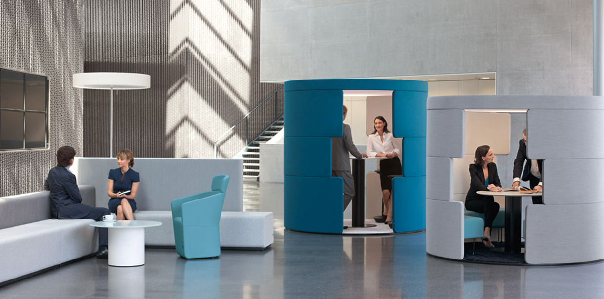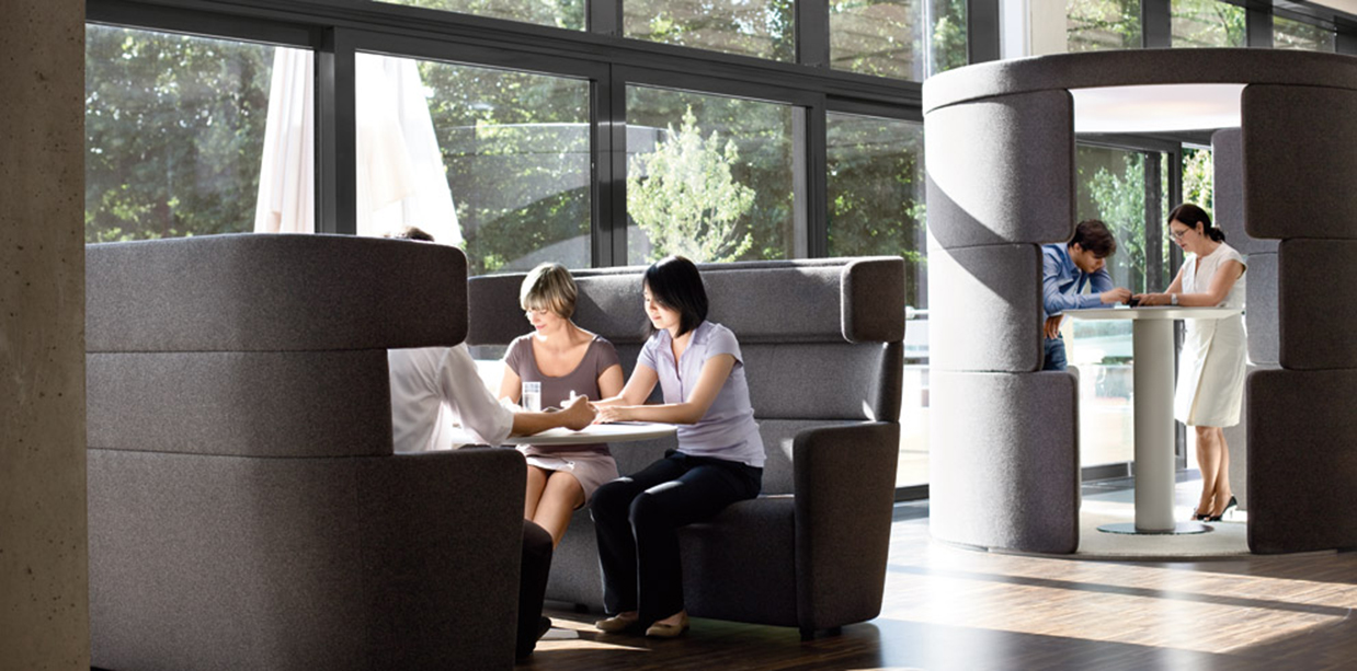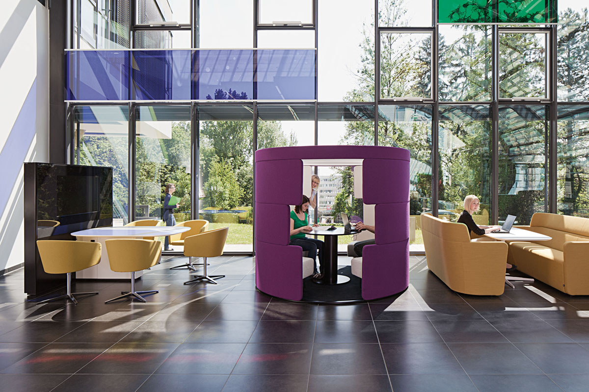 A friendly meeting-point that feels like a break-out area, accelerates teamwork, and fosters team spirit. The upholstered room-within-a-room elements create striking accents in any office and are a symbol for breaking through rigid structures.