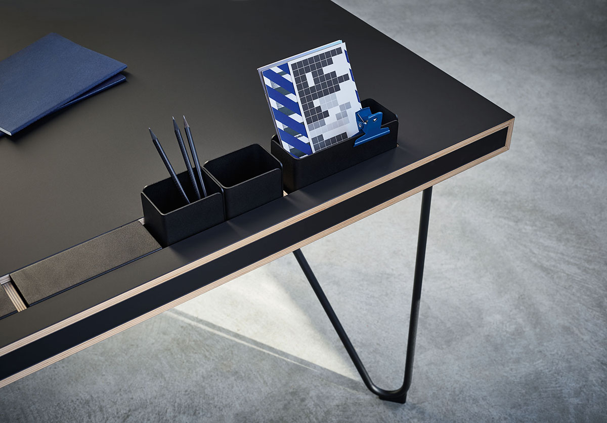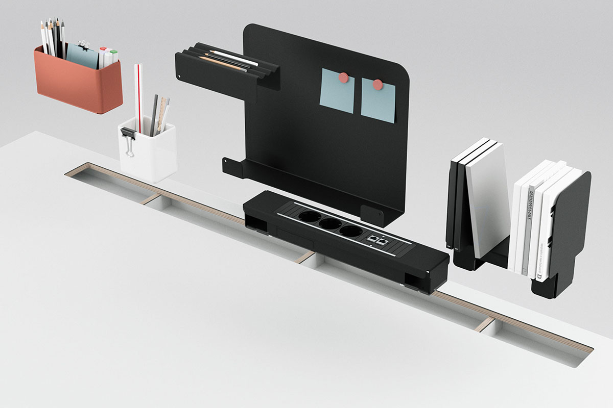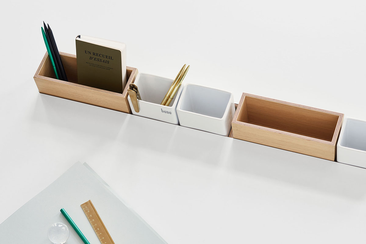 The tools we use and how we work becomes part of the office style. The Studio accessories series is available in oak or ceramic, and can also be structured powder coated in black or copper. A personal design statement right on your desk. Focusing on the essentials in an environment tailored to individual needs is vital for a healthy workflow. This is why STUDIO accessories offer a wide range of functions in different forms and colours. Add what you need for your personal organisation: toolbox, utensil tray and book ends help keep your essentials close at hand. The STUDIO Plugbox offers easy access to power, networks and media technology. Magnet boards and panels function as partitions and create space for personal notes.