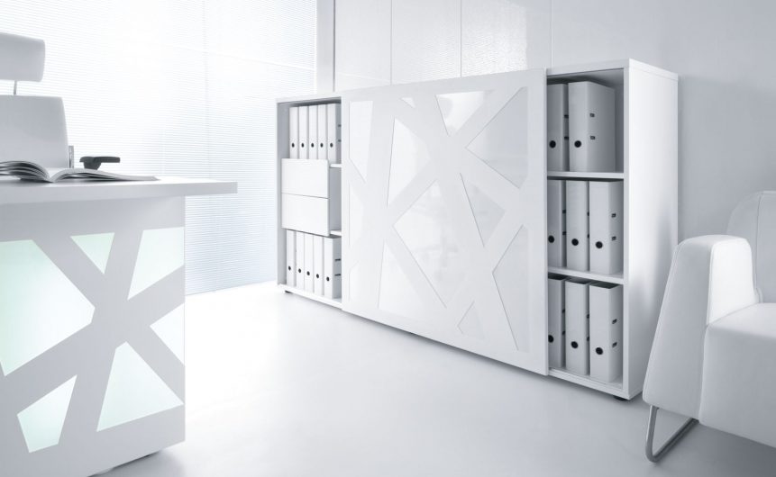 The reception desk with its original form should be enough to arrange every reception hall. It is very effective in dark rooms where it is lightened from the inside and fulfills a role of a spectacular halogen. White, metal openwork wreathing subtly round the body and contrasting with the highlighted interior is a very characteristic element of the reception desk. Beautiful frontal part of the counter hides ergonomic interior with a wide desk top which allows to organize work at the reception desk without any problems.LED lighting and metal joined with glass exhibit prestige and technical orientation of the company. Characteristic design on fronts will be an adornment to every interior. Modular construction and the possibility of adjusting the illuminance and backlight create an endless range of possibilities. That makes every reception a unique, innovative and disabled-friendly space. |