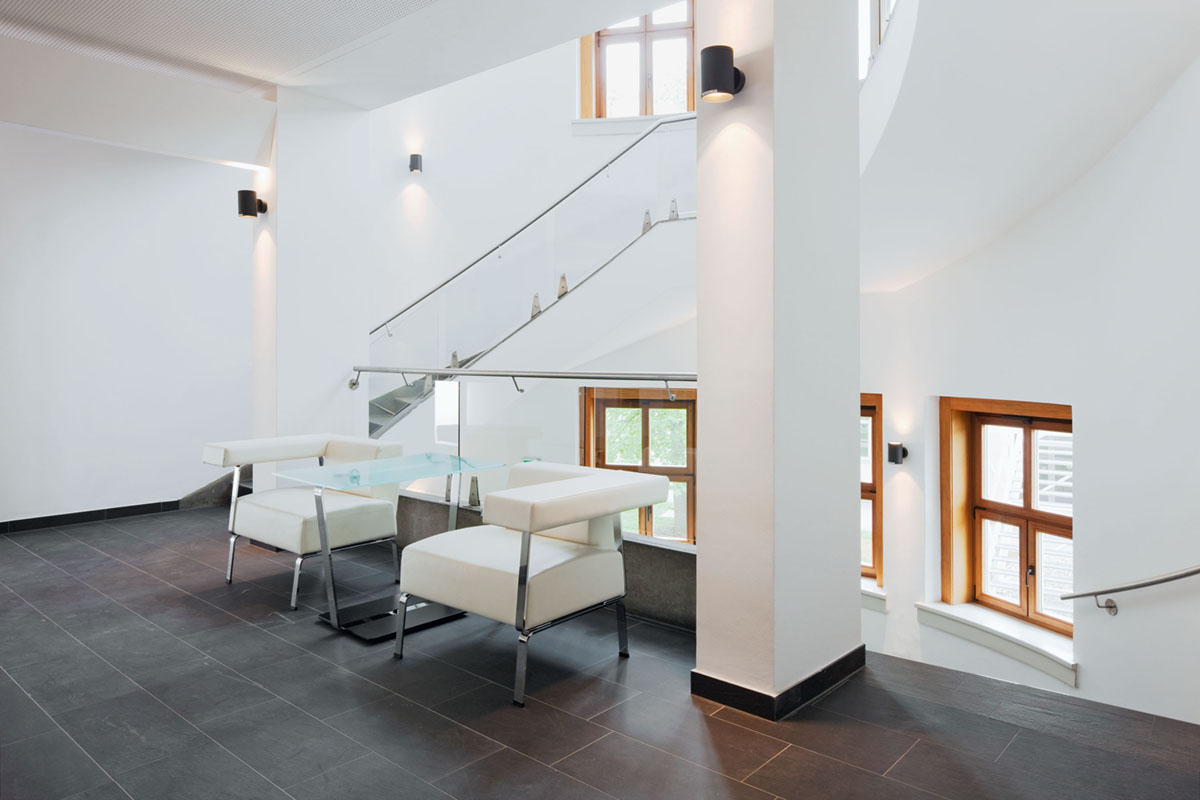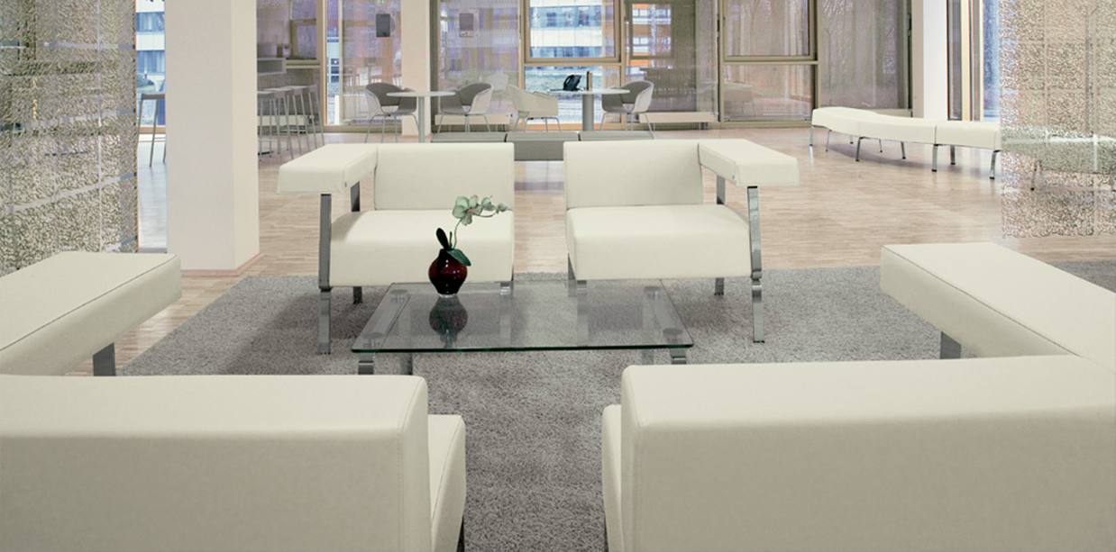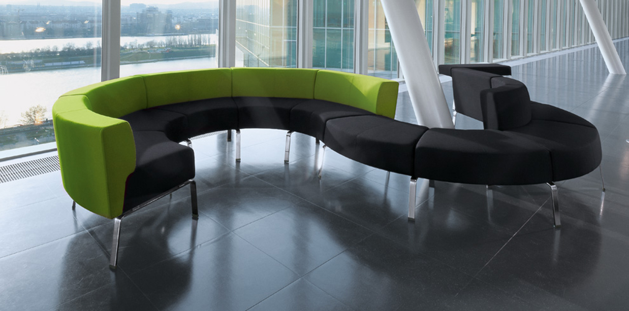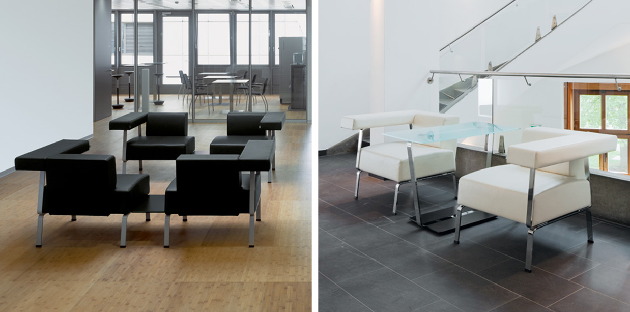 Coffice — a furniture set consisting of an armchair, sofa, bench, and table elements – ideal for waiting areas, or for communicating or working in a relaxed atmosphere. The wide armrest acts as a work surface and provides space for documents, laptops, or a cup of coffee.