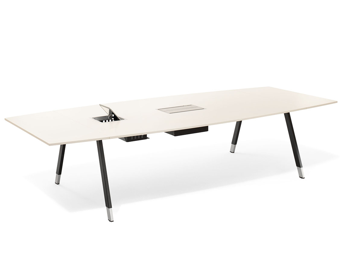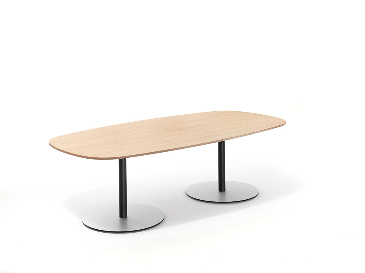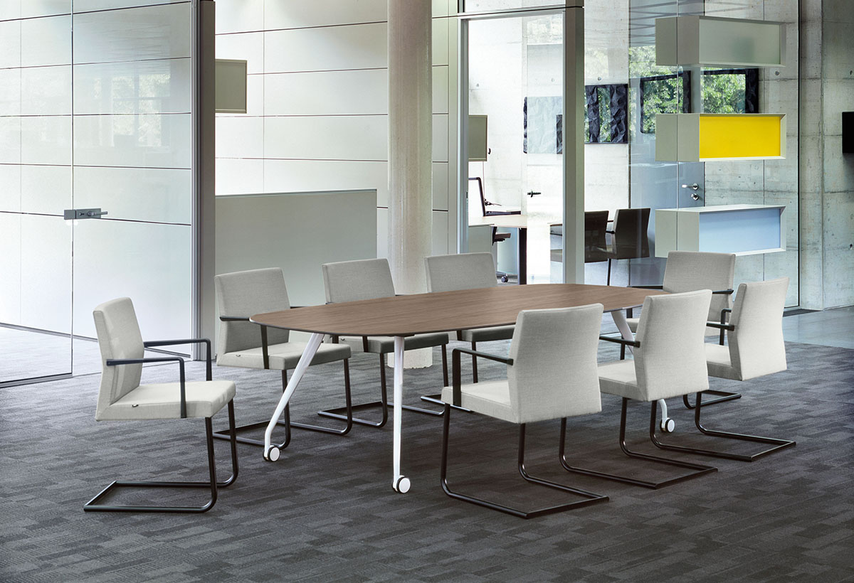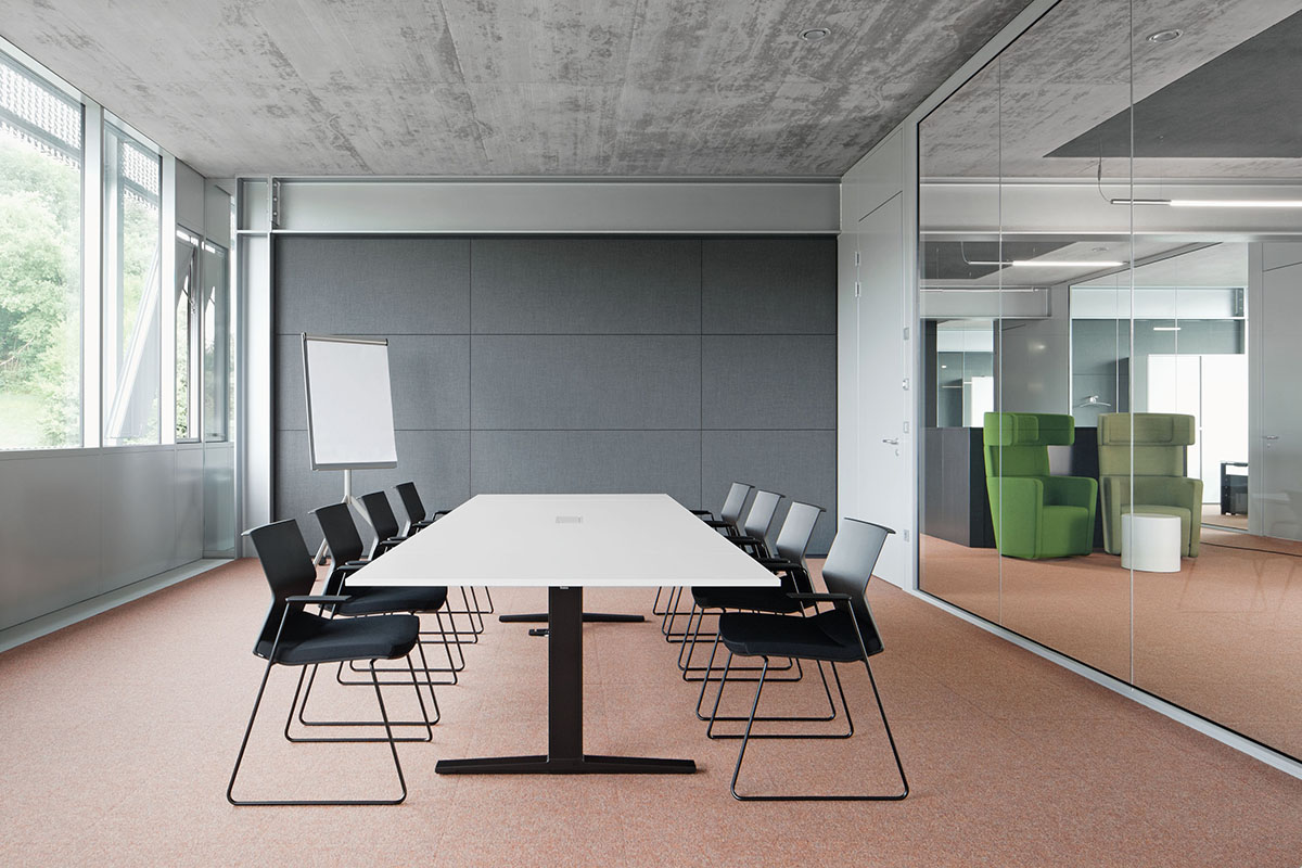 As an ensemble set of different meeting tables, T-Meeting offers solutions from smaller meeting tables to standing meeting tables right up to conference tables in multiple parts with integrated media technology. Large selection of sizes, heights, with different tabletop and frame designs, in a variety of colours and materials.