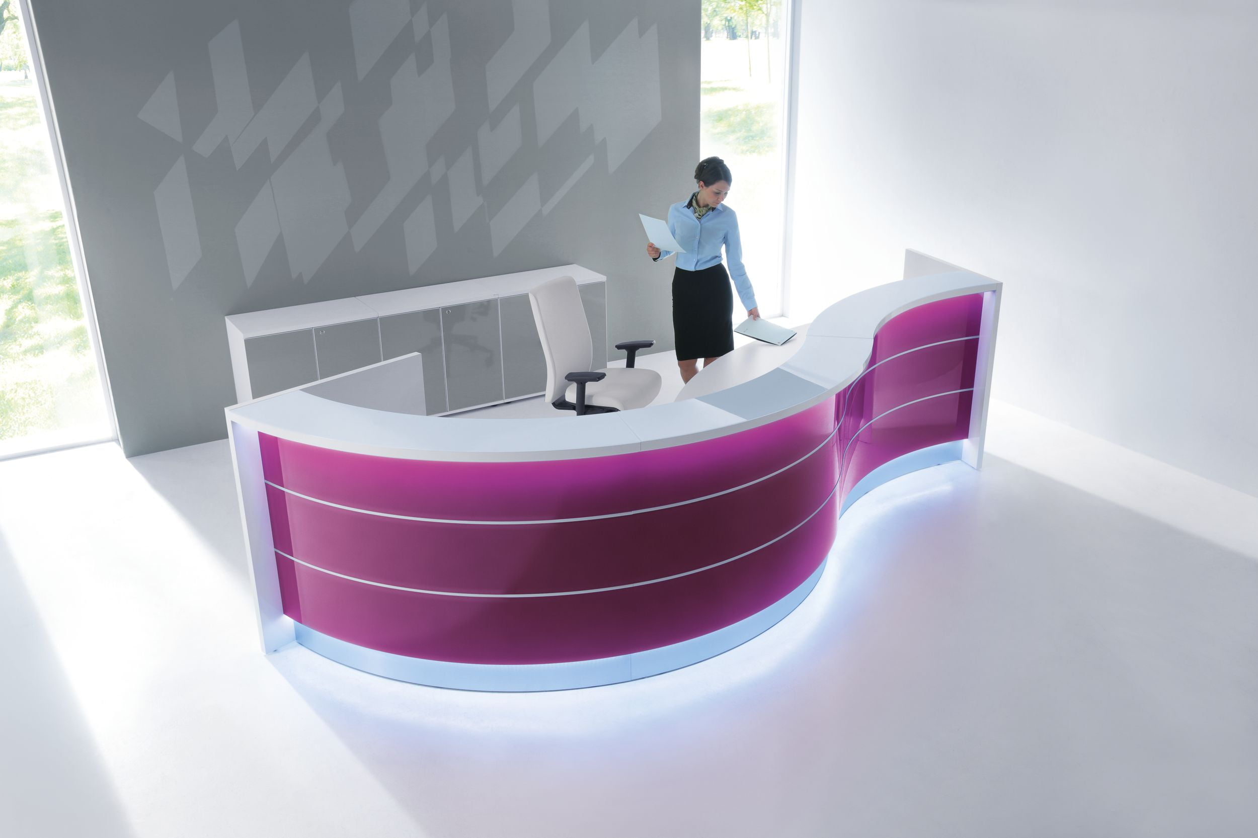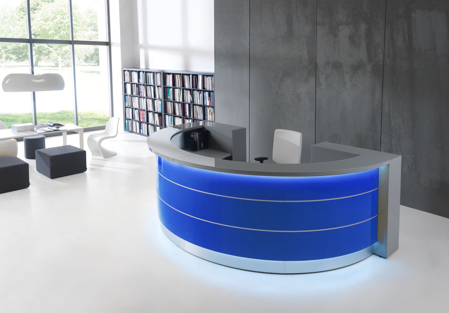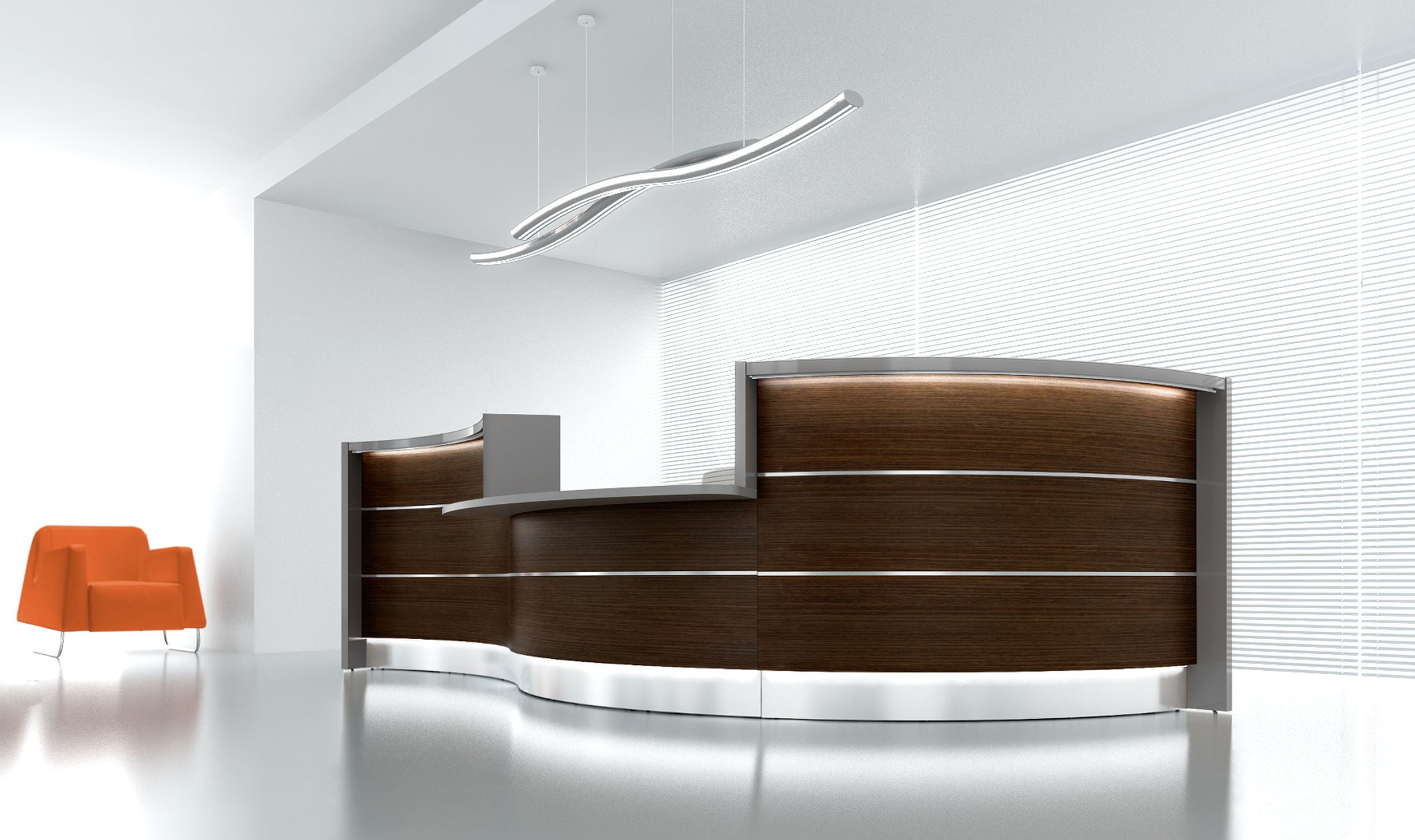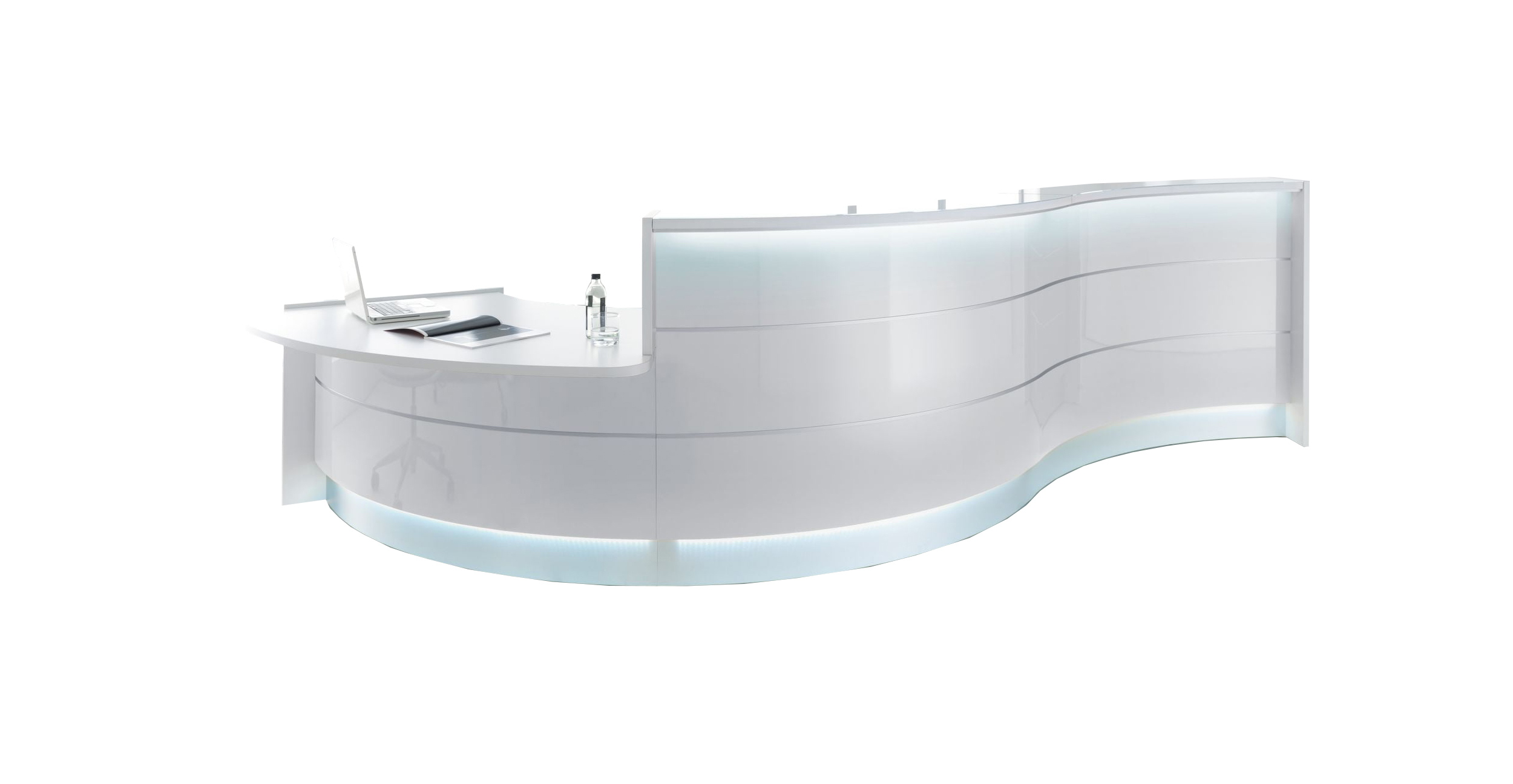 The body of the counter includes hidden handy shelves for files and a wide working table with enough space for a computer or a printer.Due to a wide range of available elements the shape of the Valde reception desk can be configured in various forms – from a circle through an arch to angular and simple blocks. It allows to arrange even small reception rooms without any problems.Glossy white fronts indicate a clean and sterile environment, colour variant can easily be adjusted to the corporate colours of an enterprise. Horizontal aluminium strips emphasize dynamics and a modern look of the counter. |